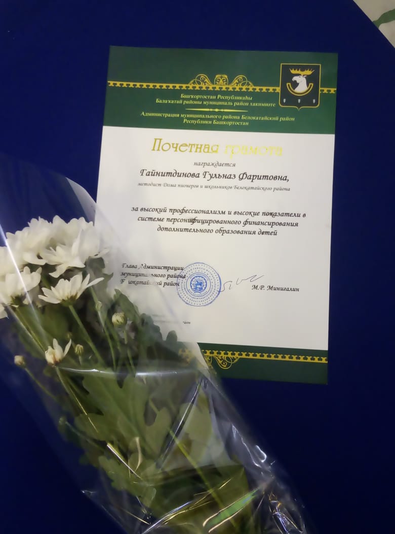 24 августа коллектив вместе с воспитанниками приняли участие в августовском совещании по образованию. Для присутствующих были представлены работы объединений, которые были созданы в рамках Федерального проекта "Успех каждого ребенка", по трем направлениям: техническое, художественное, естественнонаучное. За высокий профессионализм и высокие показатели в системе персонифицированного финансирования дополнительного образования детей почетной грамотой Администрации муниципального района Белокатайский район награждена Гайнитдинова Гульназ Фаритовна - методист МОЦ Дома пионеров и школьников.